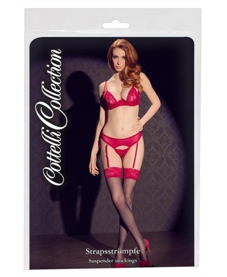 A feminine classic that stands out!Sensual stockings with red lace around the top. They should be attached to suspender straps. 20 den. Slightly preformed foot part. Oeko-Tex certified.87% polyamide, 13% spandex.