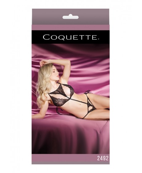Sexy teddy with side ties and choker neck detail. The panty has an open bottom. Made of stretch scallop lace.