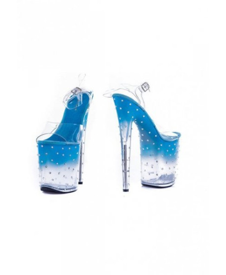 Buty obcas 18 cm platforma 10 cm. Obuwie wykonane jest na przeźroczystej lekkiej platformie. Buty dają efekt imponujący, jak gdyby były wykonane ze szkła. Przechodzą w błękitne ombre i są wysadzane szklanymi diamencikami. Dzięki specjalnej technologi buty są niewiarygodnie lekkie, nie męczą stopy. Wierzch buta zrobiony jest przeźroczystystego silikonu który dopasowuje się do stopy. Wkładka Częściowo – od pięty do podbicia – wykonana jest ze skóry dzięki czemu stopa oddycha, od podbicia do palców wykonana z zamszu czemu zawdzięczamy hamowanie stopy. Za sprawą specjalnie wykonanych wkładek stopa czuje się komfortowo. W odpowiednio wyprofilowanym obuwiu noga stoi stabilnie i wygodnie. Dzięki wysokiej platformie adekwatnie do obcasa łydki oraz stopy nie mają poczucia zmęczenia....