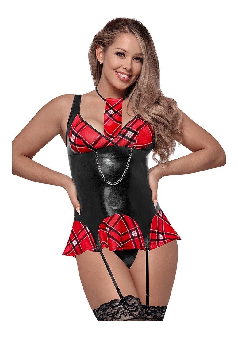 Z kolekcji Dress Up autorstwa Magic Silk, ten styl obejmuje: mini sukienkę z detal łańcucha, przymocowane podwiązki i ma dziurkę od klucza. Obejmuje również pasujący krawat kratowy i czarny g-string.