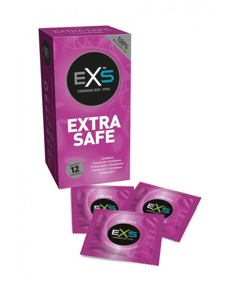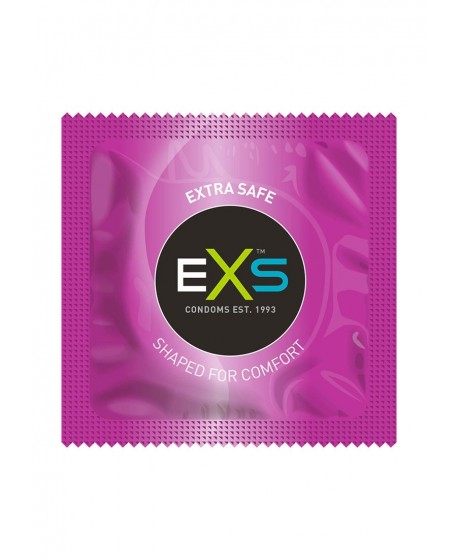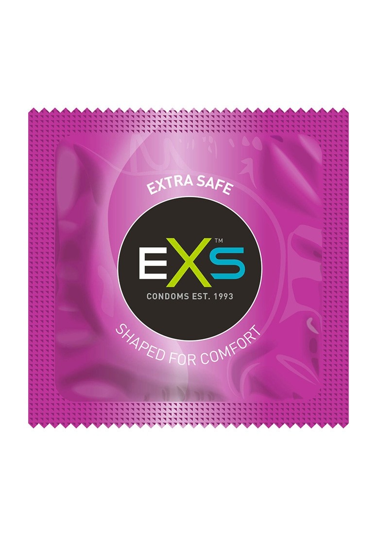 EXS Extra bezpieczne prezerwatywy są nieco grubsze lateks o grubości 0,082 mm w porównaniu do zwykłych prezerwatyw, które mają średnio grubość ściany 0,07 mm. Exs Extra Bezpieczne prezerwatywy są na to, gdy wymagane jest poczucie dodatkowej ochrony. Exs Extra Safe nie mają zapachu lateksowego i są wykonane z cienkiego, ale silnego jedwabisty lateks. EXS Extra Bezpieczne prezerwatywy są energicznie testowane na standardy europejskie i British Standards Institute (BSI)