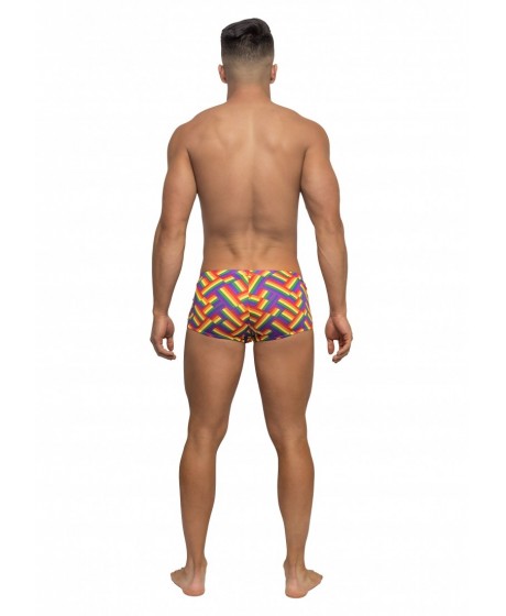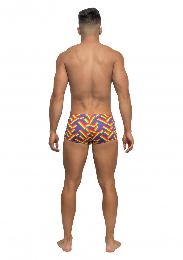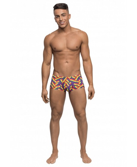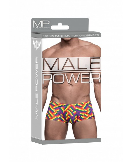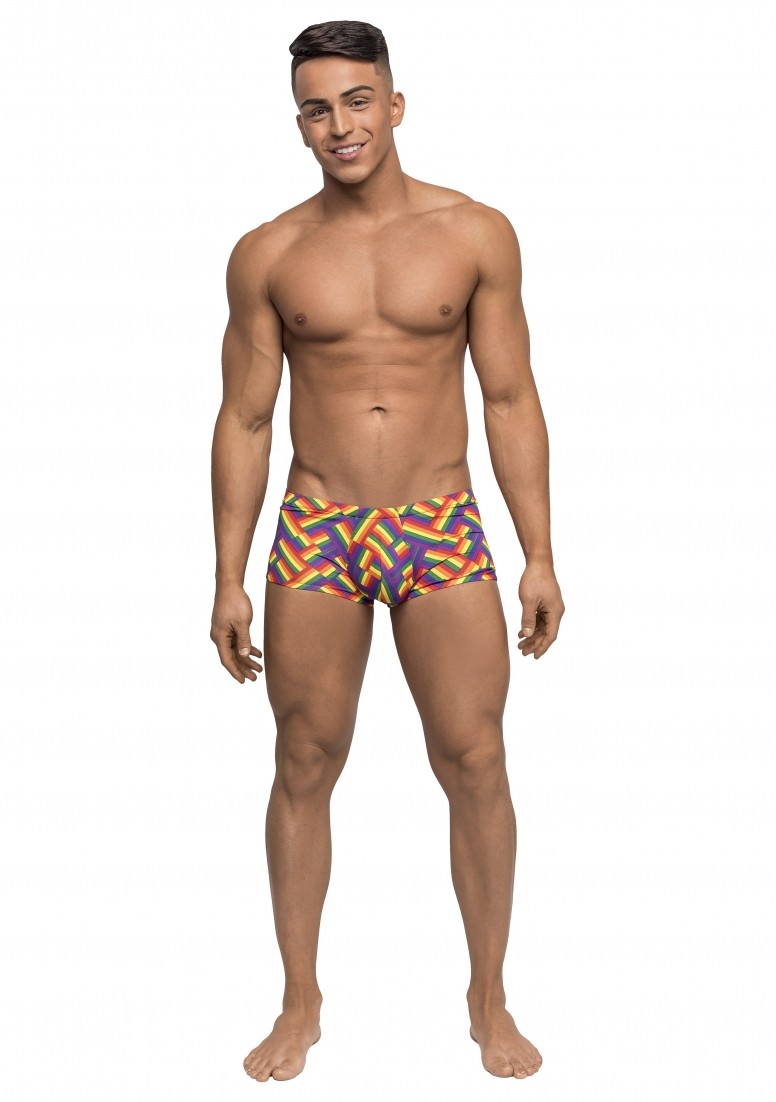 Z kolekcji Pride Fest autorstwa Male Power, ten styl obejmuje: mini Short z niskim wzrostem talii i wysoko wyciętymi nogami zawierającymi naszą wyprofilowaną torebkę komfortową i pełne tylne pokrycie. Wielokolorowy świąteczny nadruk tęczy w wzorze jodełka. Rozciągliwy i oddychający, lekki spandex Poly.