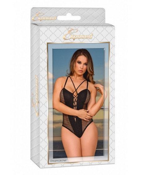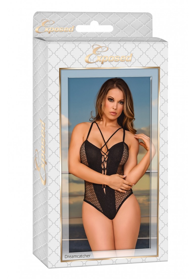 Z kolekcji Exposed by Magic Silk ten styl obejmuje: misie z koronkowymi detalami z przodu z pluszowymi elastycznymi paskami, które przechodzą przez ramiona i wiążą się z tyłu i są podkreślone przez dekoracyjne koraliki. z przemiennym metalicznym nici napełnionym poliestrem