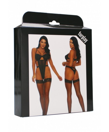 DwuczÄÅciowy komplet bielizny "Kusisz?" obejmuje stanik z zamkiem bÅyskawicznym z przodu, oraz zapinane na zamek majtki z wysokim stanem i przyszyte do nich paski do poÅczoch. Ten produkt jest dostarczany w pudeÅku.
