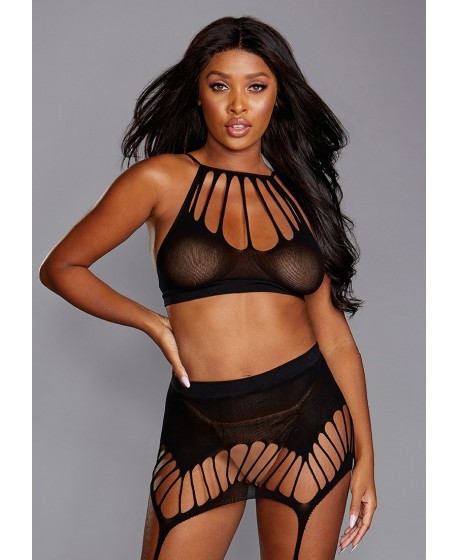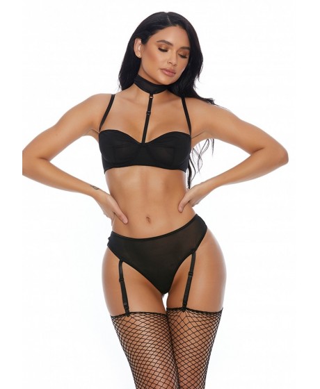 Peek-a-Boo Bra, Garter & G-Set - Black - S/M