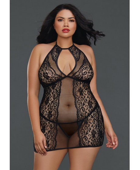 Queen Size Fishnet and Lace Chemise - Black